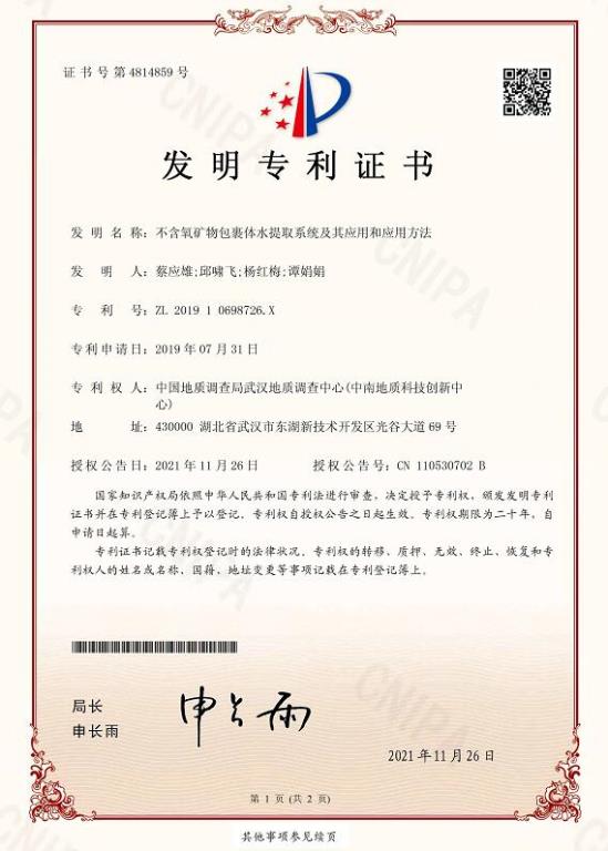 近日,中国地质调查局武汉地质调查中心研发的“不含氧矿物包裹体水提取系统及其应用和应用方法”获得国家发明专利授权,专利号:ZL 2019 1 0698726.X。