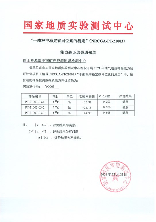 2021年12月10日,国土资源部中南矿产资源监督检测中心顺利通过油气地质样品“干酪根中稳定碳同位素的测定”能力验证项目(编号:NRCGA-PT-21003),取得了能力验证结果满意证书。