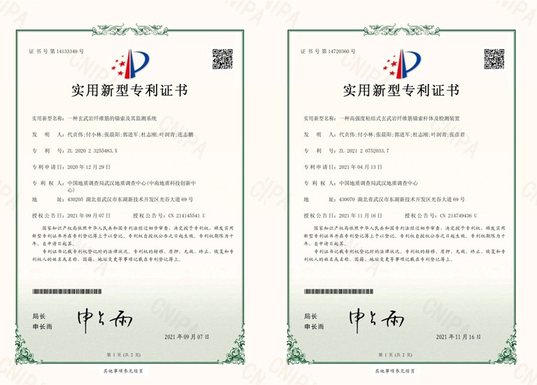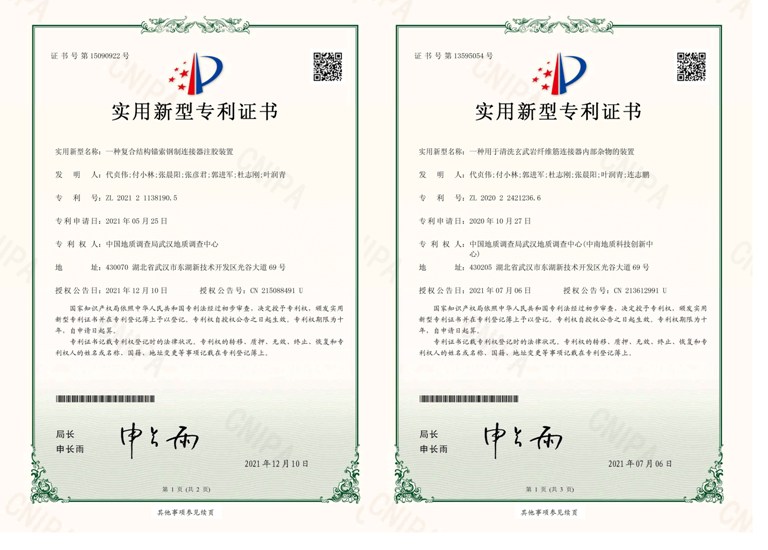 水库消落带岩体渐进性劣化形成潜在重大新生型滑坡是当前三峡库区地质安全面临的重大挑战,如何有效防控水库消落带岩体劣化是水库地质灾害研究中亟需解决的新问题。中国地质调查局武汉地质调查中心积极探索水库岸坡消落带岩体劣化防控的新技术。在三峡后续工作地质灾害防治项目“三峡库区重大新生型滑坡形成机理及全库区空间产出位置预测评价”的资助下,针对大吨位玄武岩纤维筋新型锚索试制研发过程中的难点与瓶颈,提出了系统解决方案,并就相关技术创新申请了20余项国家专利。目前,“一种玄武岩纤维筋的锚索及其监测系统(专利号ZL 202023255483.X)”、“一种高强度粘结式玄武岩纤维筋锚索杆体及检测装置(专利号ZL 202120752033.7)”、“一种复合结构锚索钢制连接器注胶装置(专利号ZL 202121138190.5)”、“一种用于清洗玄武岩纤维筋连接器内部杂物的装置(专利号ZL 202022421236.6)”、“一种用以清洗玄武岩纤维筋连接器的清洗装置(专利号ZL 202022735780.8)”5项申请已获国家实用新型专利授权。
