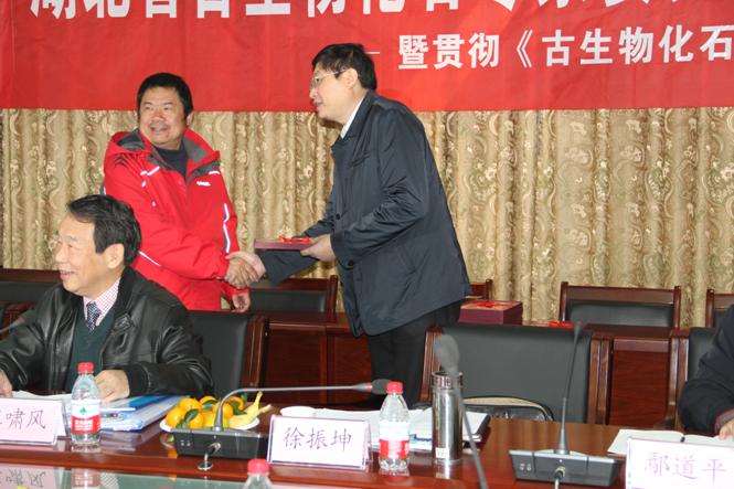 湖北省古生物专家委员会主任徐振坤向陈孝红研究员颁发聘书
