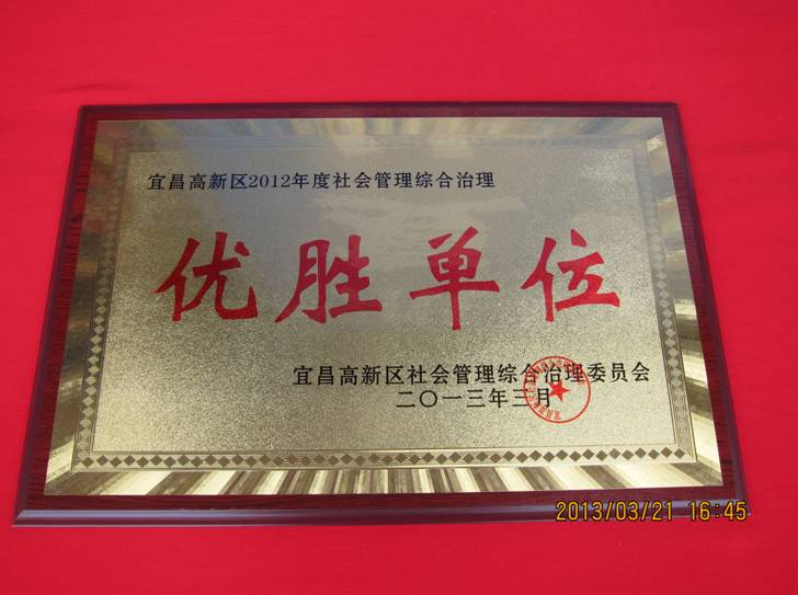 2013年3月21日,在宜昌高新区综治、维稳、消防工作会议上,武汉地调中心宜昌基地荣获“宜昌高新区2012年度社会管理综合治理优胜单位”。