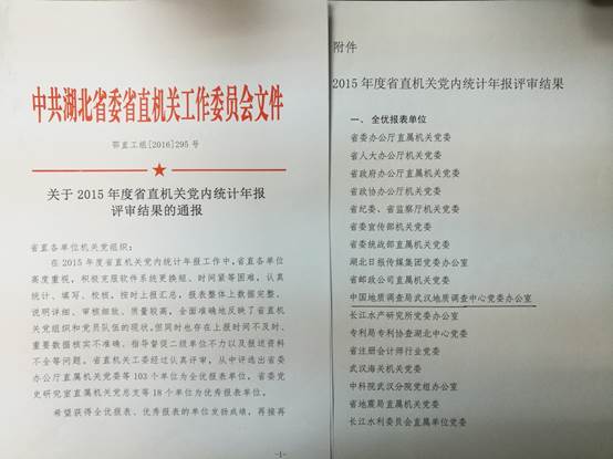 近日,湖北省直机关工委对2015年党内统计年报审核结果进行了专项通报,中国地质调查局武汉地质调查中心党内统计年报工作再获表彰,被授予2015年党内统计年报“全优报表”单位。