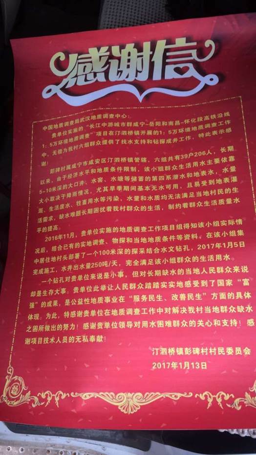 2017年1月14日,在湖北省咸宁市汀泗桥镇,彭碑村村委会将一面印有“公益地质结硕果,掘取甘泉润民心”的锦旗送到了地调局武汉地调中心在该地施工的技术人员手中,代表全体村民向武汉地调中心表达了由衷的感谢之情!