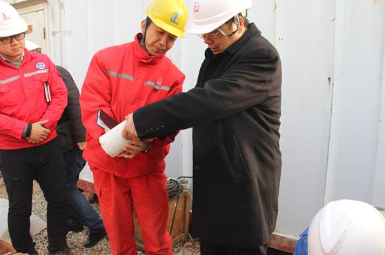 在地调局油气资源中心组织实施的鄂宜参1井现场,胡茂焱一行看望慰问了项目组和中原油田钻井施工一线人员,向他们赠送了水果等慰问品,参观了井场标准化建设,查看了钻井岩芯,为他们送上了春节祝福。