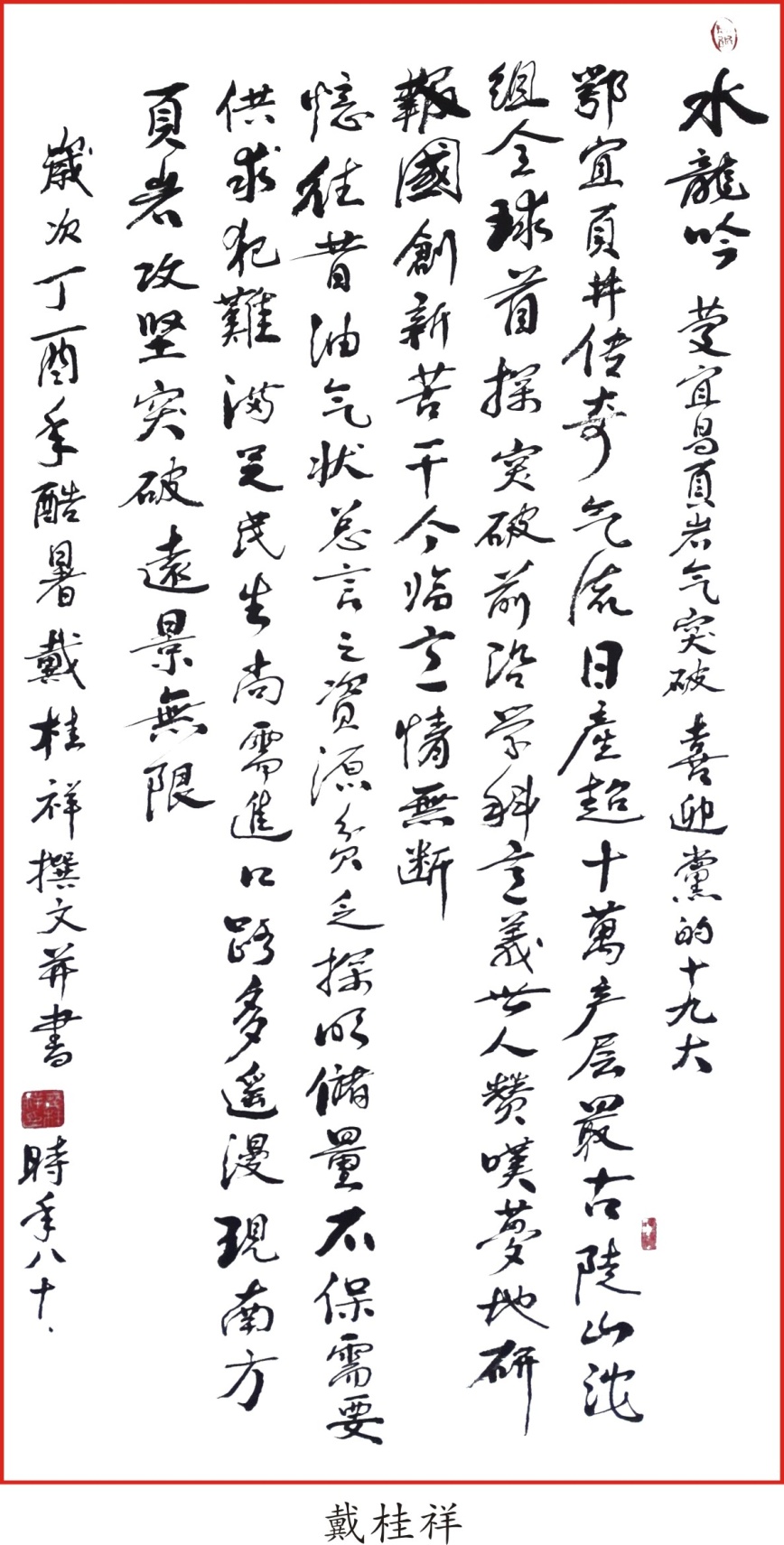 武汉地调中心老书会秘书长戴桂祥同志提交的书法作品均为他自己原创作品,表达的是对中心在南方页岩气方面取得突破的赞美和激动心情,反映了中心老一代地质人情系中心发展的炽热情怀。一首是“水龙吟·庆宜昌页岩气突破”: