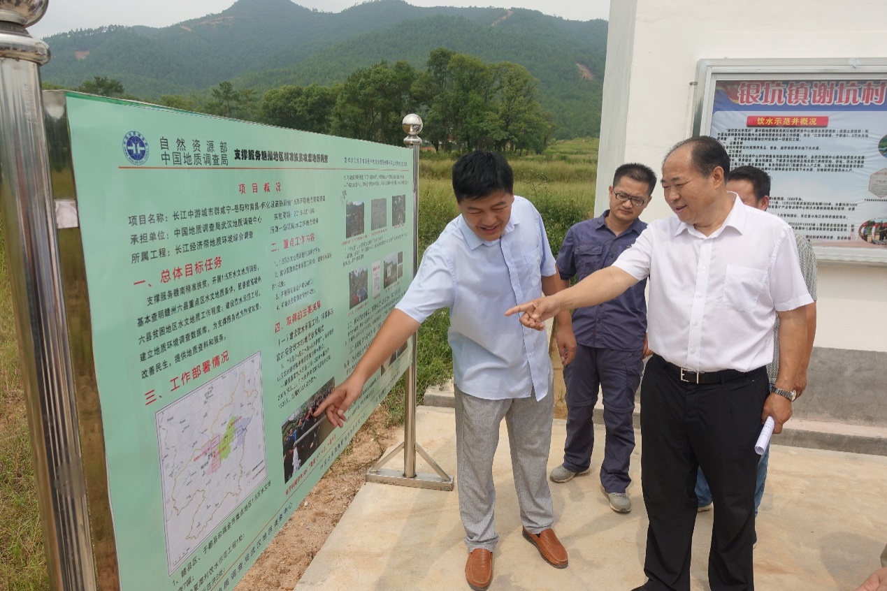 2018年9月4日,自然资源部中国地质调查局党组副书记、副局长王研一行,到江西省赣州市调研指导地质调查支撑服务赣南脱贫攻坚工作,现场考察了由中国地质调查局武汉地质调查中心实施的于都县银坑镇谢坑村饮水示范井。